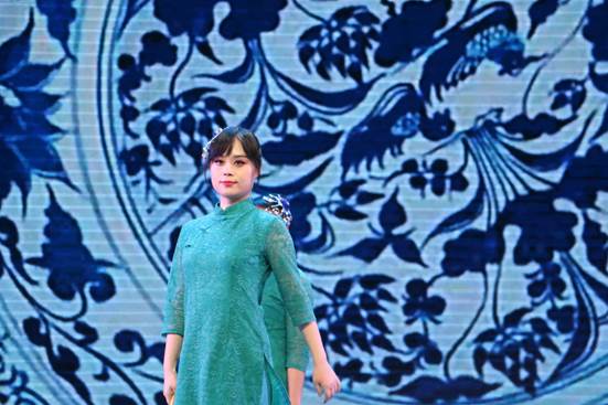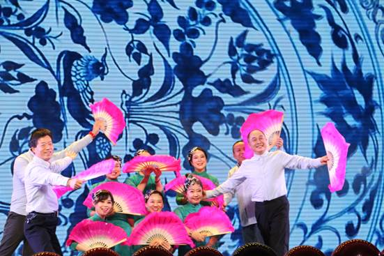 抽奖结束后,英院的老师们献上了舞蹈《青花瓷》。伴随着淡雅的旋律,老师们在舞台中央翩翩起舞。轻柔的音韵,婉转的歌声,像流水般缓缓流淌,娓娓道来的是那穿越千年的美丽。女教师们身穿蓝色旗袍,手持一把粉色扇子,在周杰伦独特的嗓音中翩翩起舞,婀娜多姿,一步一摇,曼妙无比,极具古典美。男教师也手持粉色扇子身穿淡蓝色衬衫登场,他们略显生涩的舞姿给观众带来了许多欢乐。