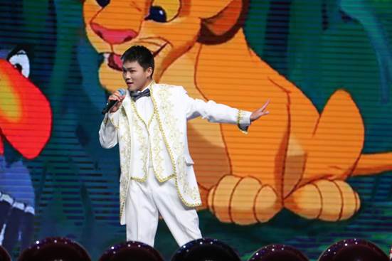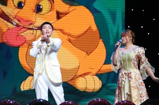 紧接着的是英文歌曲《I Just Can’t Wait To Be King》,它是经典动画电影《狮子王》的主题曲。演唱者一身白袍,犹如风度翩翩的白马王子,由观众席走上舞台,与台上身穿礼服的公主激情对唱,完美地展现了狮子王辛巴成王的强烈渴望。表演十分精彩,以至于台下观众纷纷为表演者呐喊“打CALL”。