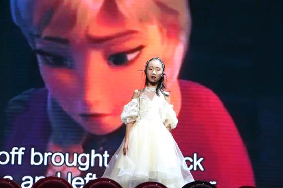 伴随着舞台灯光的亮起,香港现代教育集团的两位小朋友分别带来了配音秀《Frozen》和《TheScary Tiger》,他们不但有着萌哒哒的外表,还能说出一口惊人流利的英语,还能给动画配音,让台下的英语学子们惊叹不已,纷纷献上阵阵掌声。他们清脆可爱的声音就像汩汩的流水,欢快动人。