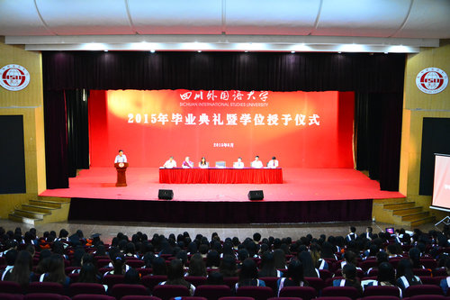 明国辉书记勉励同学们要养成终身学习的习惯,希望听到同学们成功的消息。随后,伴随《川外情》音乐,进行授予学位仪式。