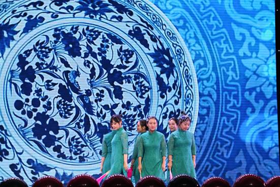 抽奖结束后,英院的老师们献上了舞蹈《青花瓷》。伴随着淡雅的旋律,老师们在舞台中央翩翩起舞。轻柔的音韵,婉转的歌声,像流水般缓缓流淌,娓娓道来的是那穿越千年的美丽。女教师们身穿蓝色旗袍,手持一把粉色扇子,在周杰伦独特的嗓音中翩翩起舞,婀娜多姿,一步一摇,曼妙无比,极具古典美。男教师也手持粉色扇子身穿淡蓝色衬衫登场,他们略显生涩的舞姿给观众带来了许多欢乐。